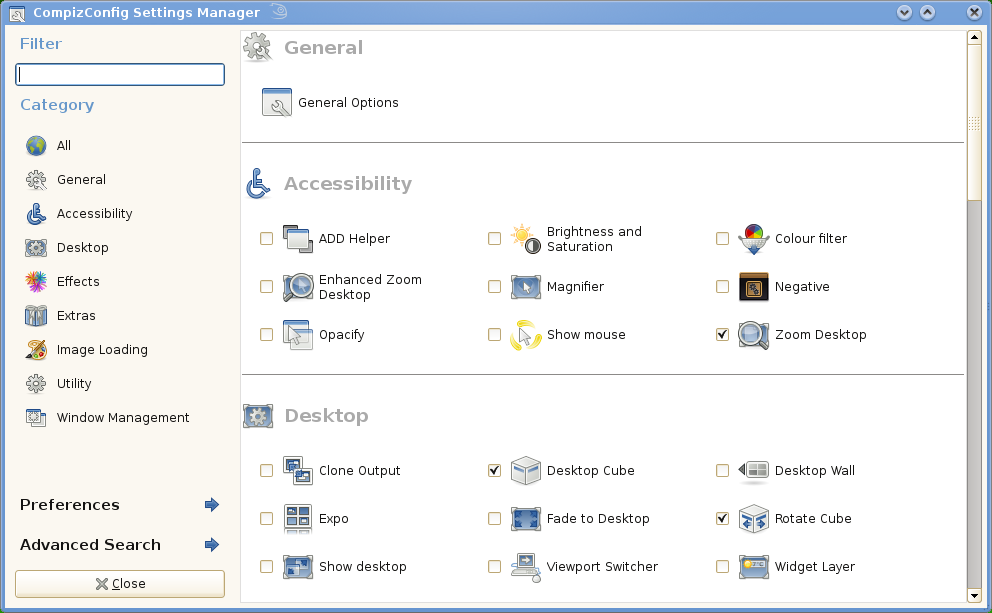 在 Compiz 核心方面,我们改进了窗口和会话管理、焦点窃取预防以及处理多个输出设备。我认为 Compiz 现在是处理所有各种 Xrandr 多个输出配置的最佳窗口管理器。在 Compiz Fusion 方面,我们添加了一些新插件、新功能并修复了许多错误。这里无法详细说明所有更改,但用户可以使用高级 CompizConfig 设置管理器 ccsm 来发现新插件和现有插件的新功能。