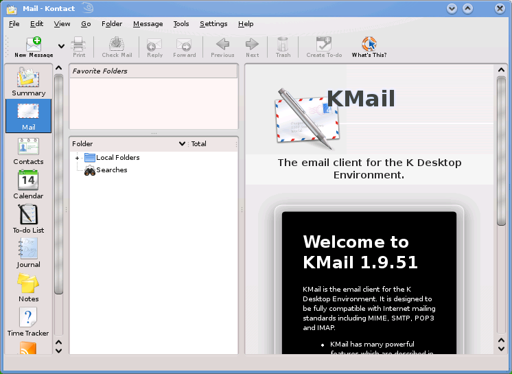 KDE 4.0 不包括 KDEPIM(KMail、KOrganizer、Akregrator、KNode 等),因此 openSUSE 11.0 包含来自 KDE 4.1 的 KDEPIM 应用程序的 beta 版本。这些应用程序运行良好,并将尽快通过官方在线更新更新到最终版本。