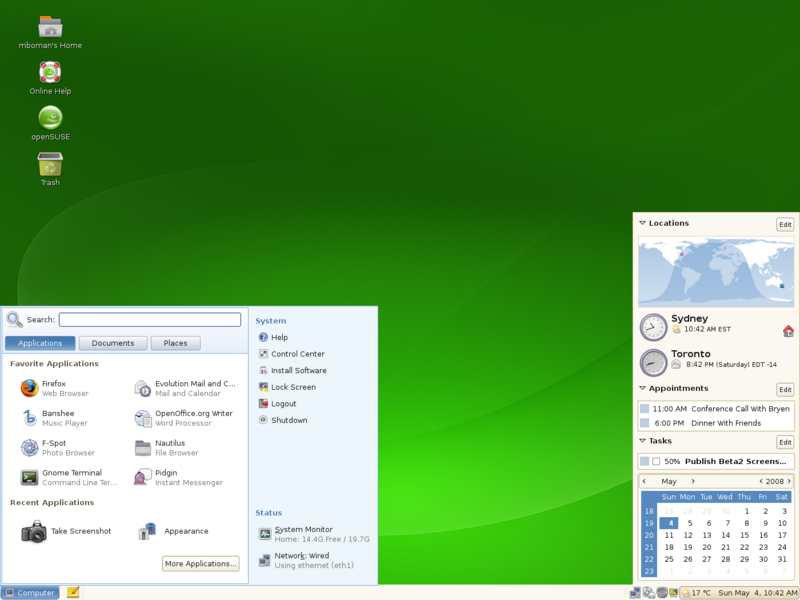 openSUSE 11.0 中的 GNOME 2.22 包括 GNOME 虚拟文件系统 (GVFS),对联网文件系统提供更好的支持,PulseAudio 提供更好的声音管理,Evolution 和 Tomboy 得到改进,以及 更多!
