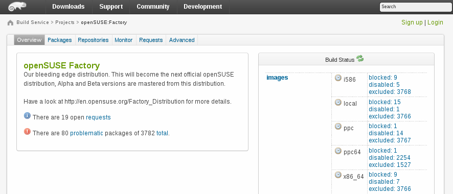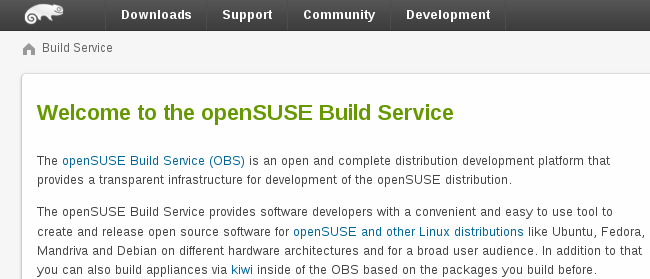 公共服务器 //build.opensuse.org 适用于所有开源开发者,用于为最流行的发行版(包括 Debian、Fedora、Mandriva、openSUSE、Red Hat Enterprise Linux、SUSE Linux Enterprise 和 Ubuntu)构建软件包。它也被用于构建 openSUSE 和 MeeGo 发行版。