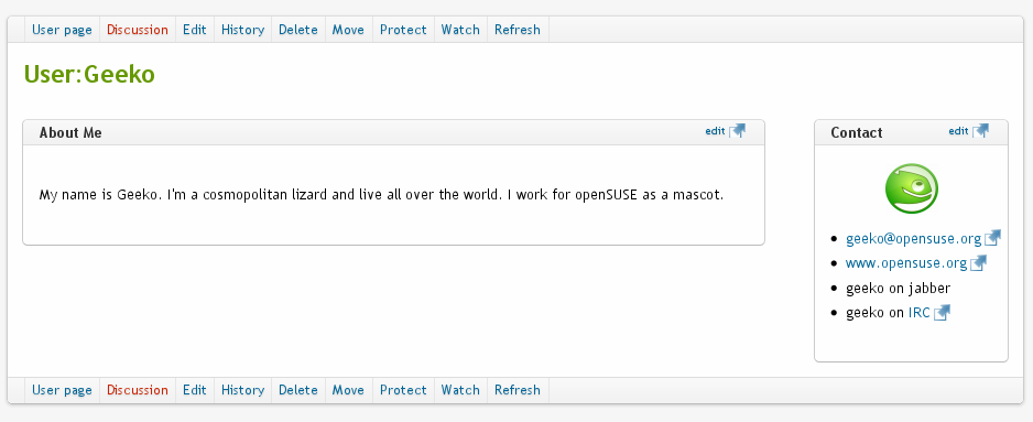 你也可以当然转移你旧的用户页面。只需访问 //old-en.opensuse.org/User:Geeko 即可找到内容。