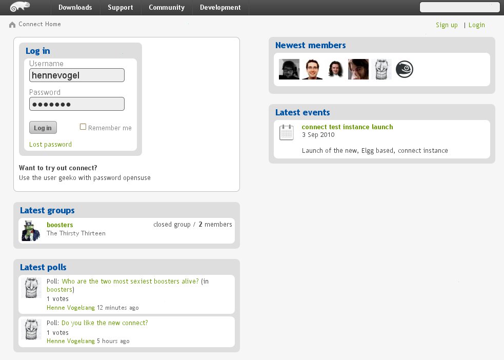 Connect 旨在成为 openSUSE 项目的中央用户数据库。听起来很乏味,不是吗?但您了解 Boosters,我们所做的一切都带有独特的风味,Connect 也不例外。这里的风味是许多精巧的社交网络功能,例如用户资料、添加好友、群组、活动日历,以及可能更多。这是因为我们在用户数据库之上使用了一个名为 Elgg 的免费软件社交网络框架。Elgg 将帮助我们进一步提升 openSUSE 项目最重要的领域之一:连接我们的社区。目前我们在代码连接方面做得很好,但还没有一个中心场所供 openSUSE 用户交流、建立关系和结识合作者。