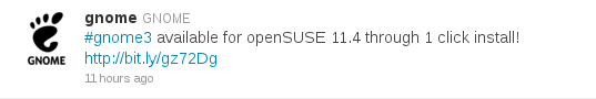 等待终于结束,备受期待的 GNOME 3 在 openSUSE 的最新发行版 11.4 上发布,现已准备好在您附近的桌面下载。 openSUSE GNOME 团队成员 Frederic Crozat 一直不懈努力,通宵达旦地使 GNOME3 稳定到足以供大家使用。 请参阅他的 博客 以获取完整详细信息。 GNOME 基金会的的朋友也用一条欢迎推文欢迎 GNOME 3 登陆 openSUSE。