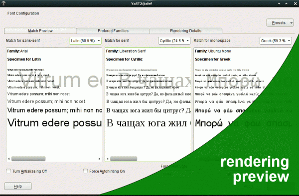 用于管理系统范围字体配置的模块已经在其 Github 仓库中可用了一段时间。 最近,随着该软件包被包含到 openSUSE Tumbleweed 中,它的作者在博客上写了关于它以及 openSUSE 中字体的一般状态。 正如您在截图中看到的那样,它提供了对系统中 sans、serif 和 monospace 通用别名的微调以及它们应该如何呈现的方式。