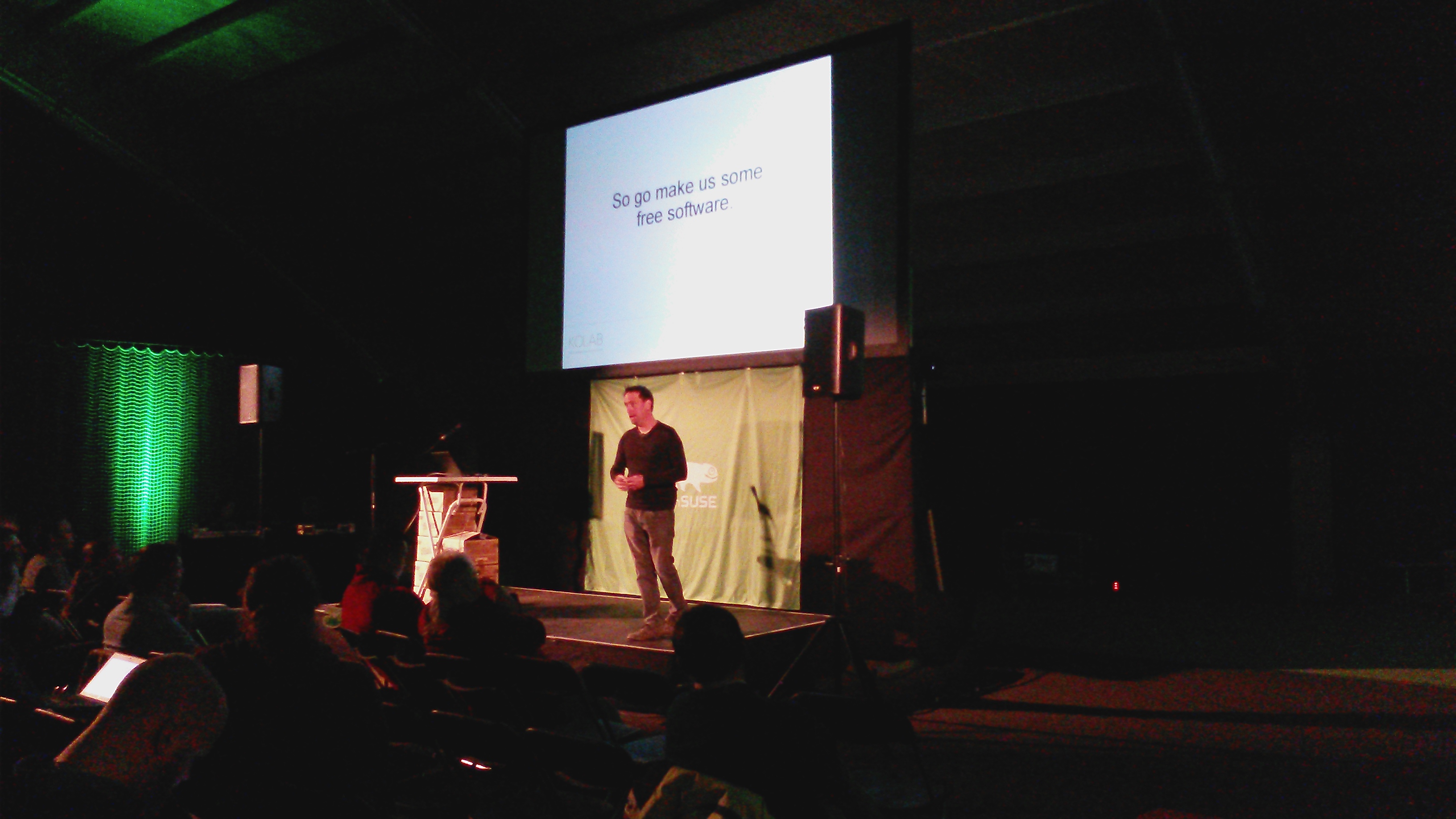 另一位主题演讲人 Aaron Seigo 并没有让人失望;他是一位天生的公众演讲者,口才好,吸引了观众的兴趣。简单来说,Aaron 是一个如果你有机会听到他演讲,你不想错过的演讲者。Aaron 充满激情地谈论了使用和开发自由开源软件的原因。他的观点是,FOSS 等同于自由;摆脱不透明的闭源软件的自由。