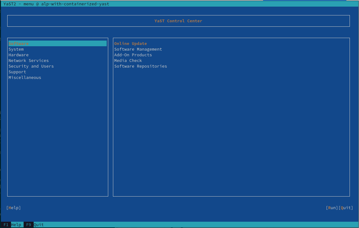 无缝的系统集成将在稍后实现,并且可能因工作负载类型而异。例如,可以通过 rpm 部署的 /usr/bin 包装器等。一个示例是在 ALP 或实际上任何启用了 podman 的 Linux 系统上运行 YaST 工作负载的 ncurses 变体。